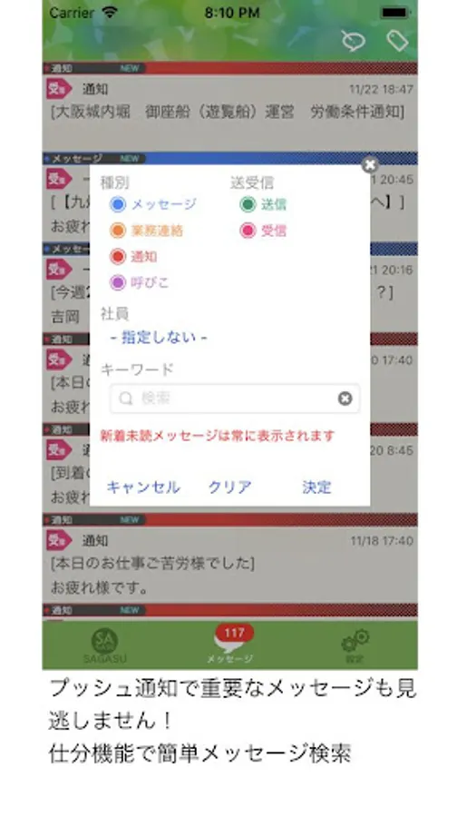 何より送信・受信メッセージそれぞれに絞り込み、フリーワード検索機能があり、トークの管理がスムーズ