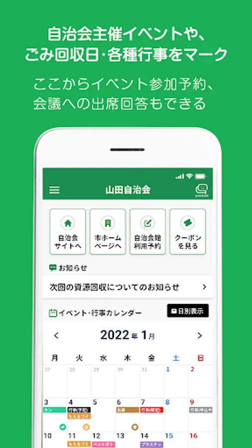 Yumicom is the person in charge of actually carrying out the residents'association luck that started to change the problems of "insufficient officers", "aging problem", "delayed IT" and "diluted local communication" of the residents' association management. However, in order to improve various problems of residents'association management, it is an application that assists the activities and operations of various organizations such as residents' associations that were created by exchanging opinions among residents.
