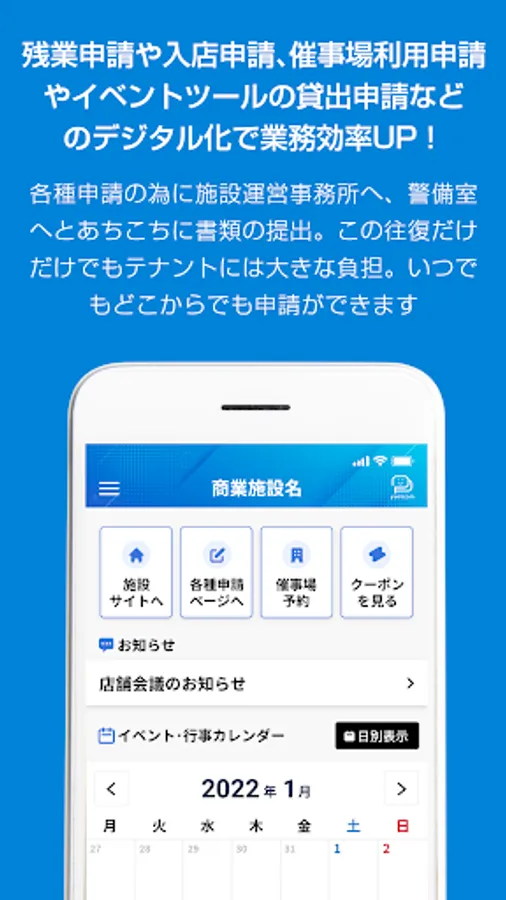 By making "overtime work application" and "admission application" to the facility management office via the app, you can simply save time going back and forth to the office.