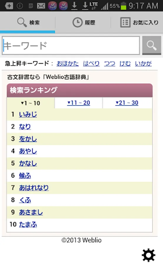 Weblio's Dictionary of the Classical Japanese is a free online dictionary of ancient words that allows you to search for ancient words that appear in ancient texts. Approximately 23,000 ancient words are registered, and you can look up the meaning of various ancient words, including conjugations of auxiliary verbs in ancient sentences and translations of classical examples.