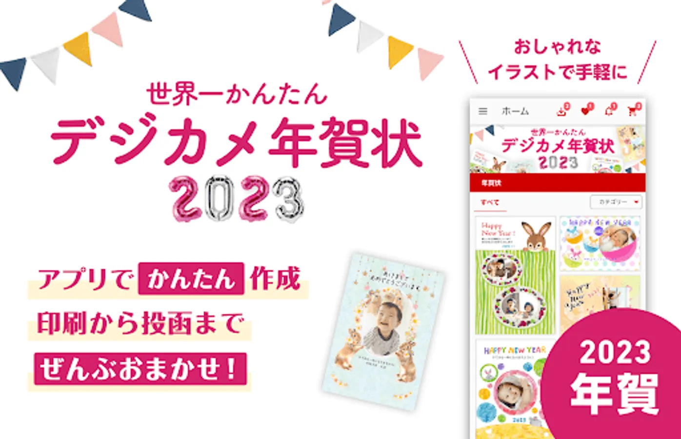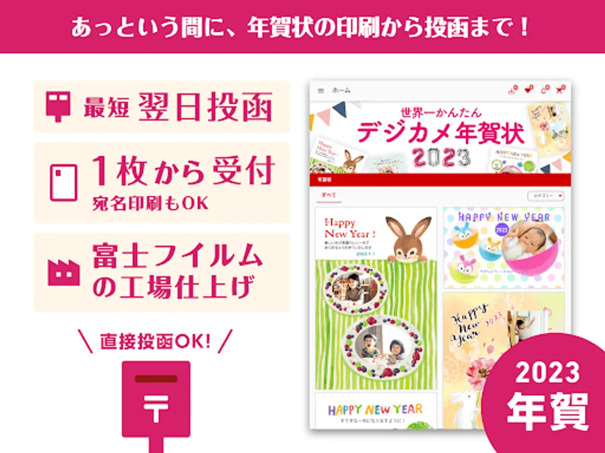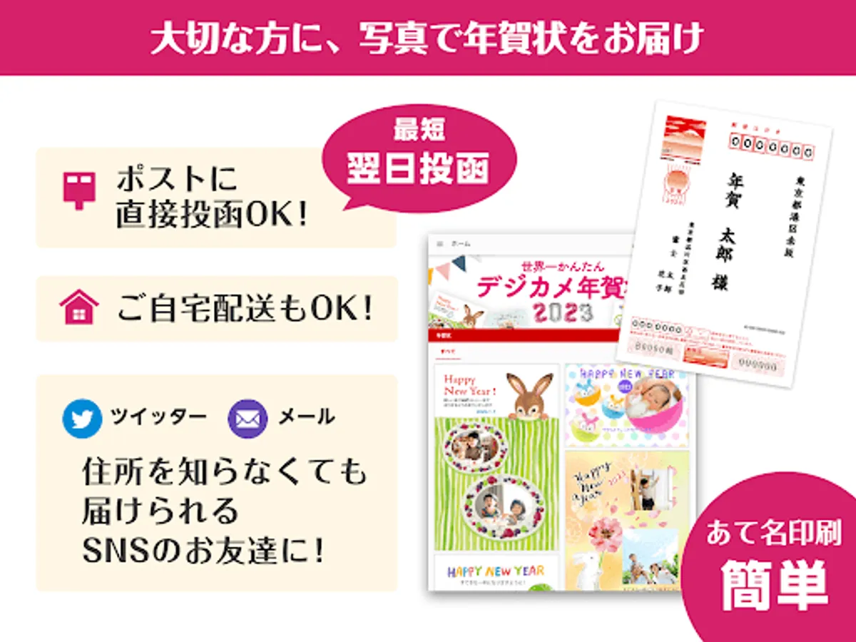 "Complete on your smartphone, make this year's New Year's card" The definitive New Year's card smartphone app that allows you to create, print, and mail New Year's cards!