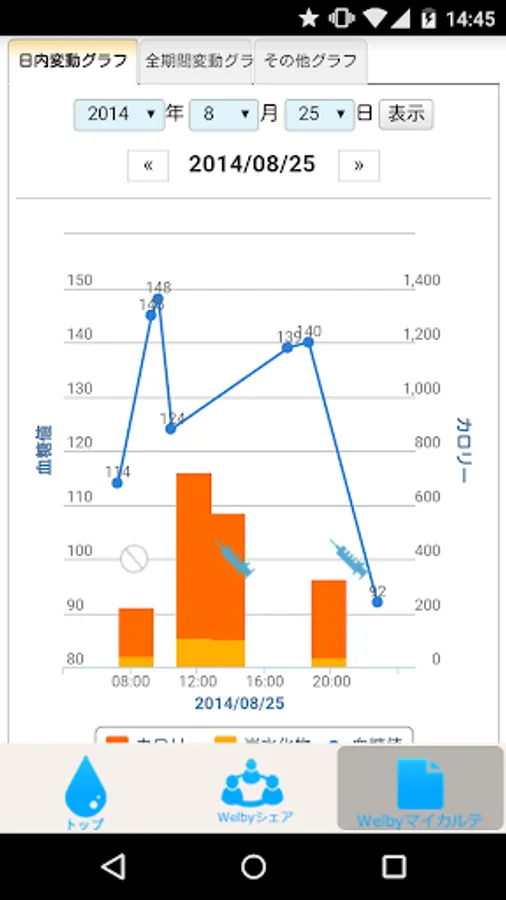 朝食前、朝食後、昼食前、昼食後、夕食前、夕食後、就寝前それぞれの時間帯ごとに測定した血糖値のグラフが表示されます。