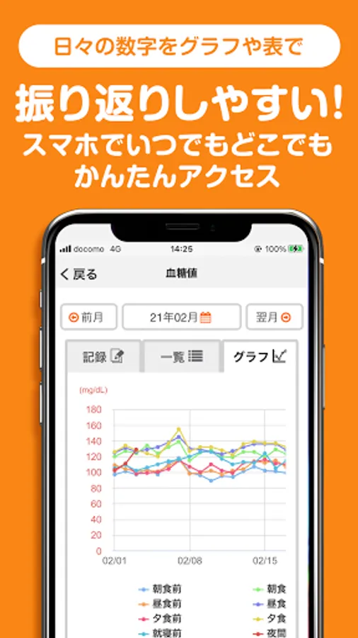 Recorded data is automatically collected in the app just by measuring with various linked devices such as a designated sphygmomanometer, self-monitoring blood glucose meter (SMBG), weight scale, activity meter, etc., and you can easily continue self-recording. It is also possible to record manually, which is easy to do.