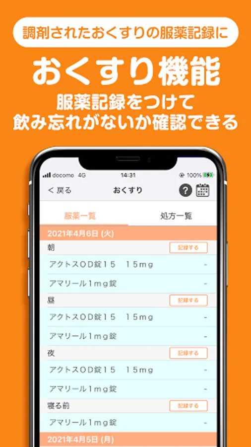 You can record your medication and register prescription medications as a medicine notebook. You can also set daily medication notifications.
