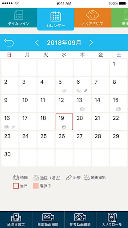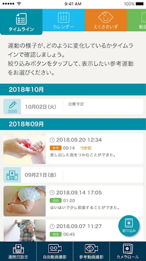 On the timeline screen, you can check when and what your child was doing in chronological order for each reference exercise. You can also register the hospital visit date and display it together.
