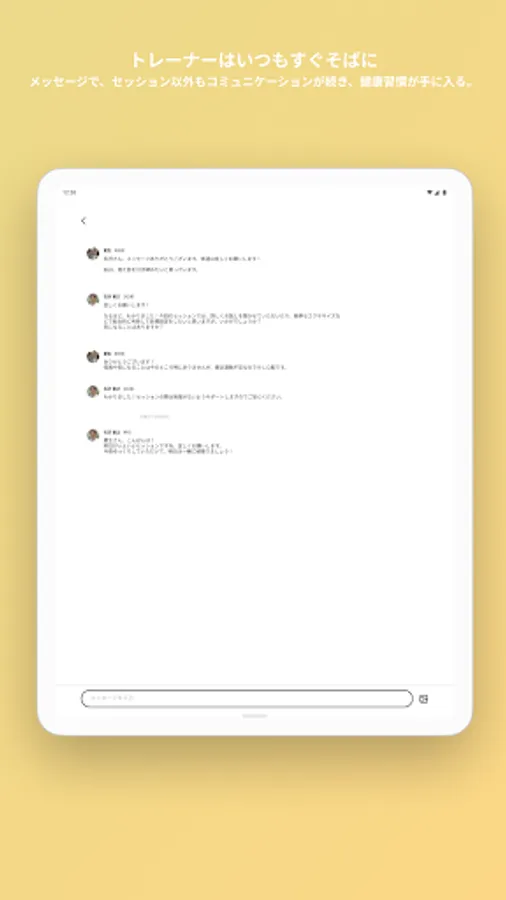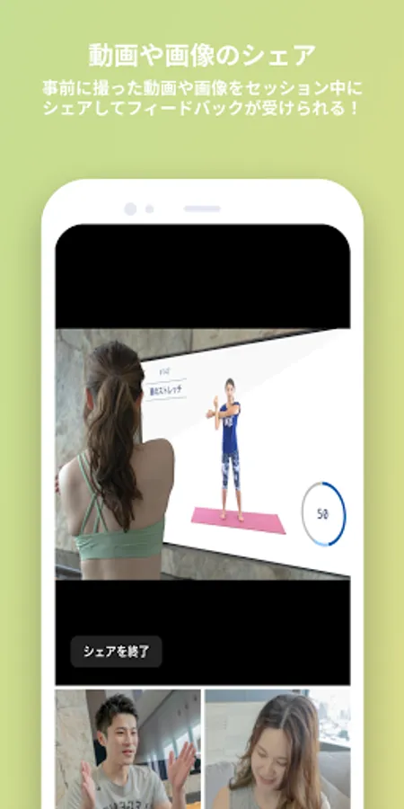 With a message in advance, you can start the session with peace of mind on the day. Because it is a session-specific video call function, you can concentrate on the session without stress and feel a certain effect. You can easily share videos and photos during the session and receive feedback on the spot.
