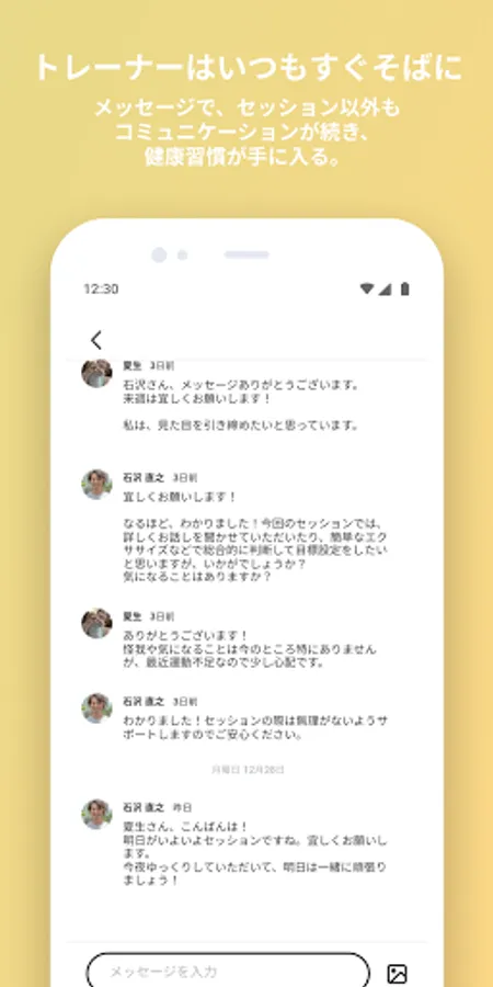 The remote session function, which allows you to have sessions with trainers at any time and place, can expand your good encounters. Even after the session, you can exchange messages with the trainer, so you can quickly resolve any concerns or questions.