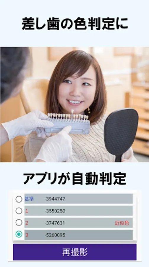 "What color is your tooth?" The app answers that question. Judgment and recording of whitening tooth color. Reference / record of color tone acquisition inspection. Make an accurate judgment using the shade guide. It is a tooth color diagnosis application.