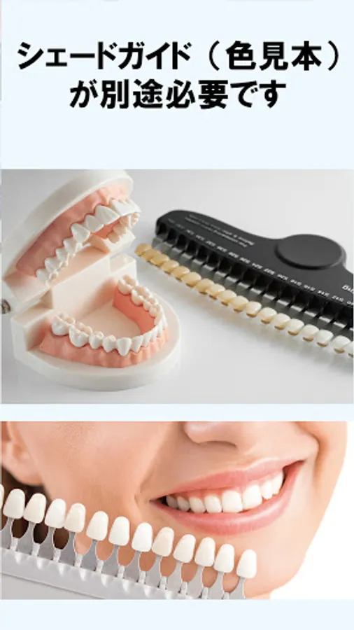 A shade guide is a guide device (scale) in which tooth models of different whiteness are lined up. In addition to being used mainly for office whitening by dentists, it is also used for color tone acquisition inspection during crown prosthesis to determine the color of the insert tooth (front crown, metal bond).