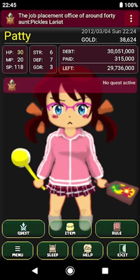 You first have to receive a quest from the "Pub Master" (the aunt of the childhood friend) and venture into dungeons to complete these quests. If you find items, you have to identify and sell them, so you can earn and save money in order to repay your debt.