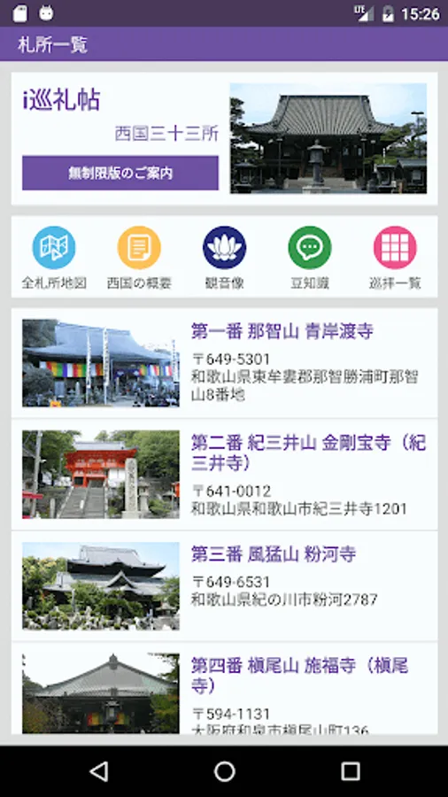 札所巡礼アプリ「i巡礼帖」西国三十三所編は、事前に西国三十三所の全体札所地図、各札所のアクセス、各札所概要、周辺情報、豆知識、観音像等を事前に確認でき、札所の本堂にてGPS機能でチックインすると各札所のご本尊の観音様のスタンプが押されます。参拝一覧では、今まで巡拝した札所とそうでない札所が一覧できます。結願の回数も表示されます。