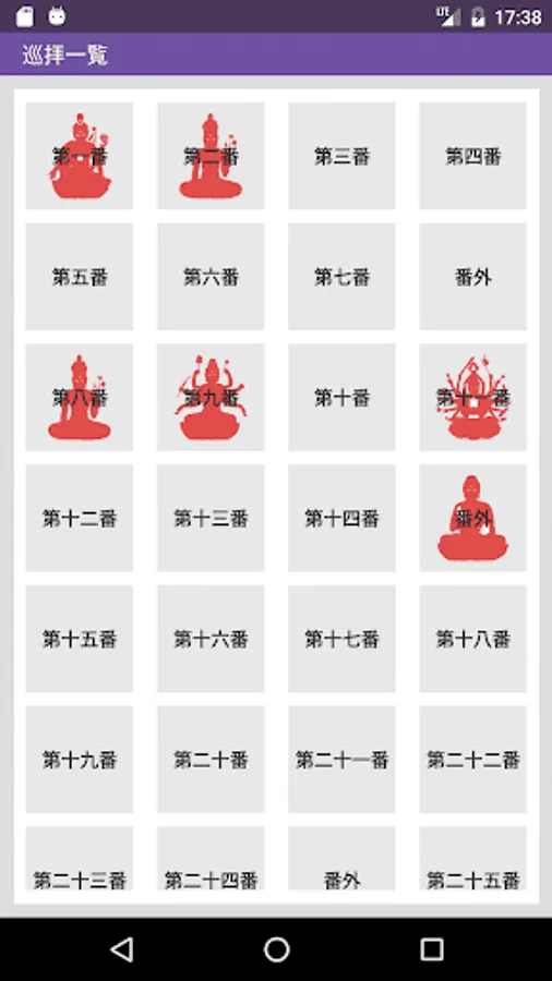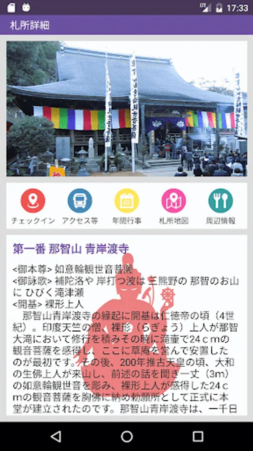 5. 各札所の本堂付近でチェックインすると、その札所のご本尊の観音様のスタンプが押されます。また、どれだけの札所を巡拝したかは、参拝一覧で見ることができます。