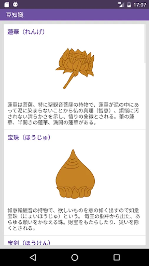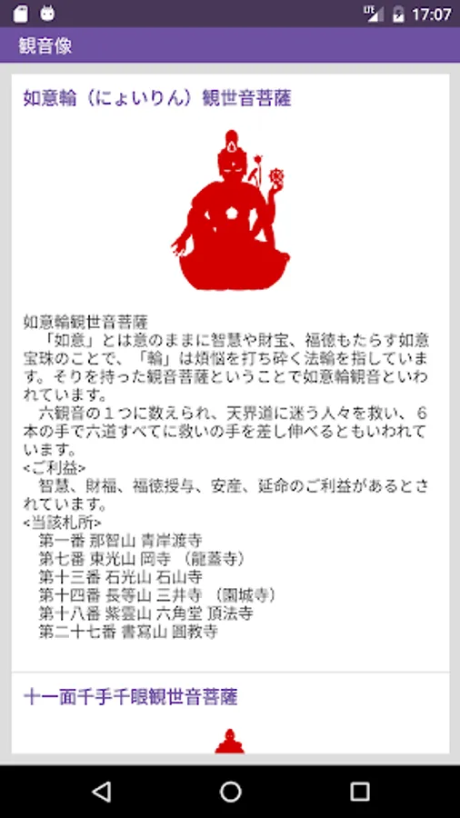 3. 西国三十三所の各札所のご本尊である観音像と持物の解説が表示されます。