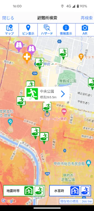 In addition, hazard maps such as landslide warning areas and flood inundation areas are displayed, so you can check the danger of your current location.
