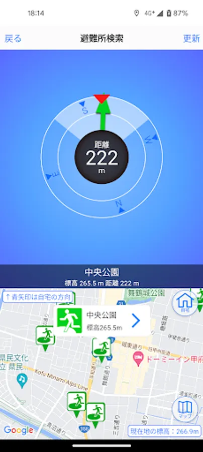 Designated evacuation shelters and designated emergency evacuation sites near your current location and details are displayed, and the AR camera function and evacuation compass function support evacuation actions in the event of a disaster.
