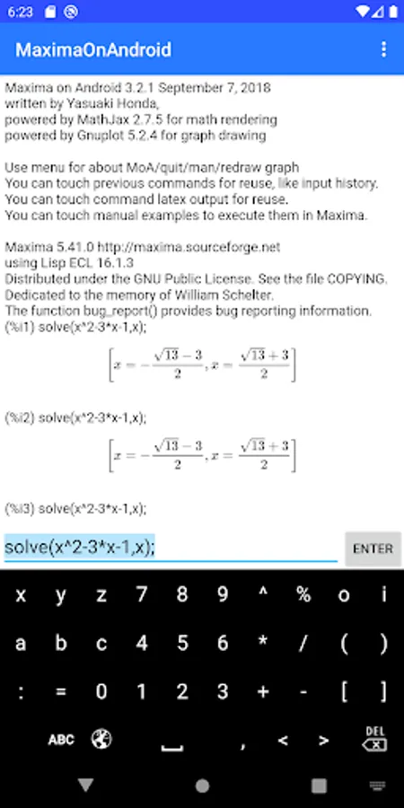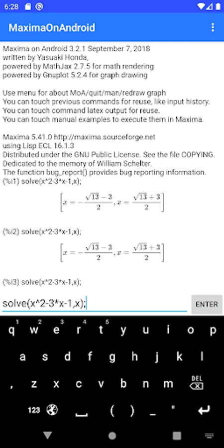 Maxima Keyboard makes your typing commands in Maxima on Android a lot easier than using other soft keyboards (or input methods). Using other soft keyboards, you need to switch between querty keyboard and symbol keyboard frequently. This frequent switching is drastically decreased in the symbol keyboard layout of Maxima Keyboard.