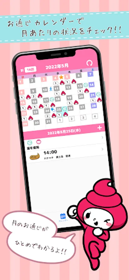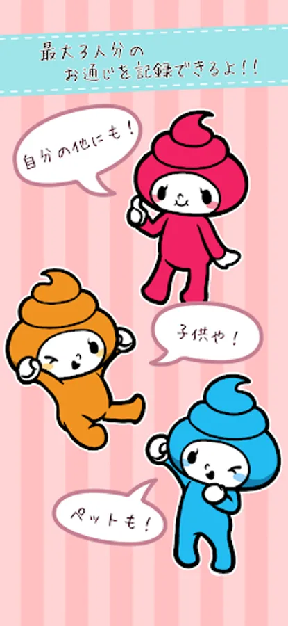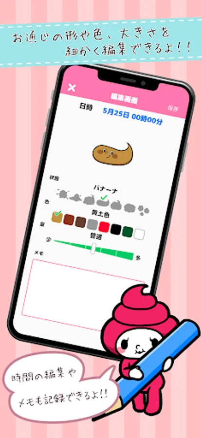 You can record time, type of poop (amount, shape, color, etc.) and memo.