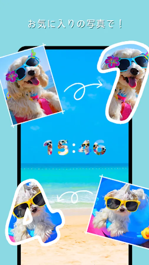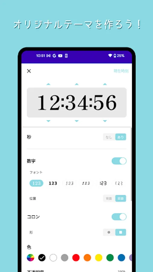 Customize to your liking! You can change the color, type, and transparency of the number font, show/hide it, set a photo or original illustration as the front/back of the numbers, and with the number cutout function, you can easily cut out your favorite image in the shape of the numbers 0-9 and use it as a clock!