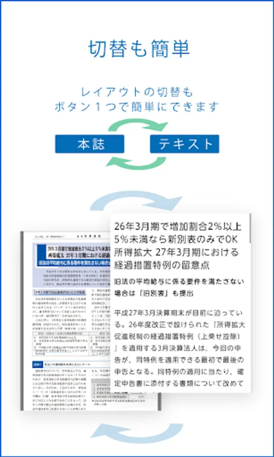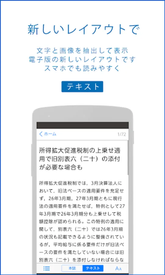 本誌のレイアウトそのままで読む、スマートフォン等に最適化したレイアウトで読むといった機能と