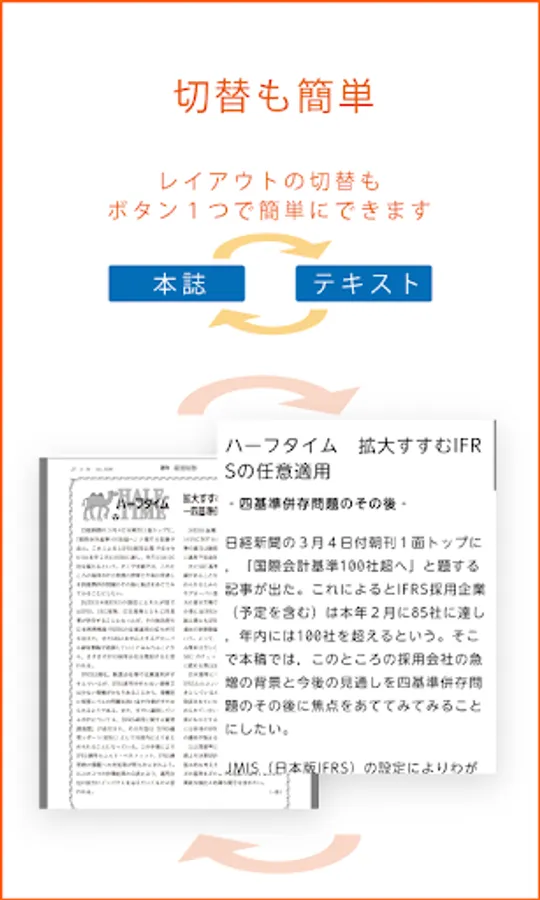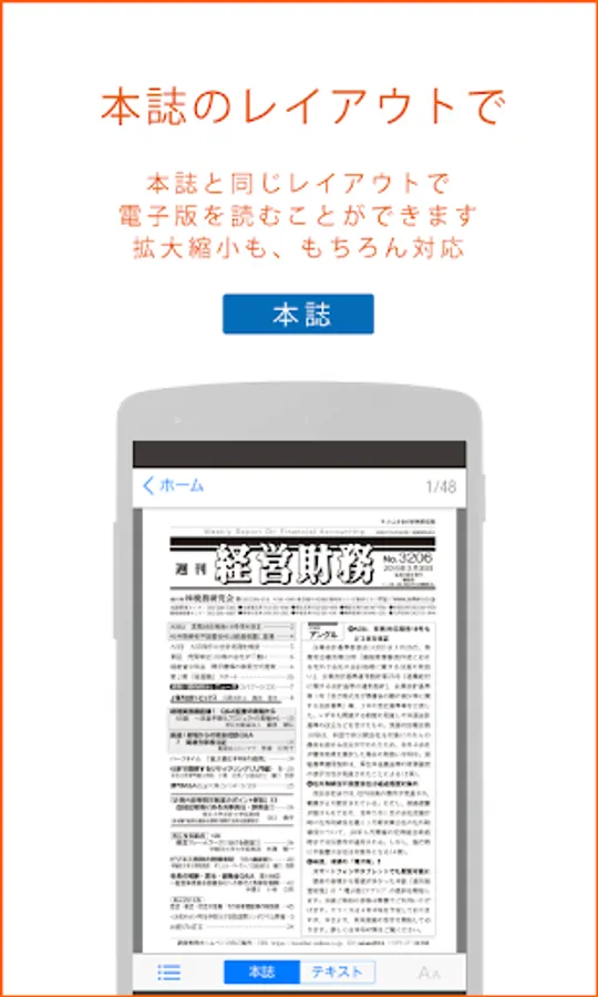 本誌のレイアウトそのままで読む、スマートフォン等に最適化したレイアウトで読むといった機能と