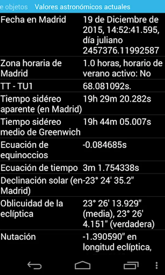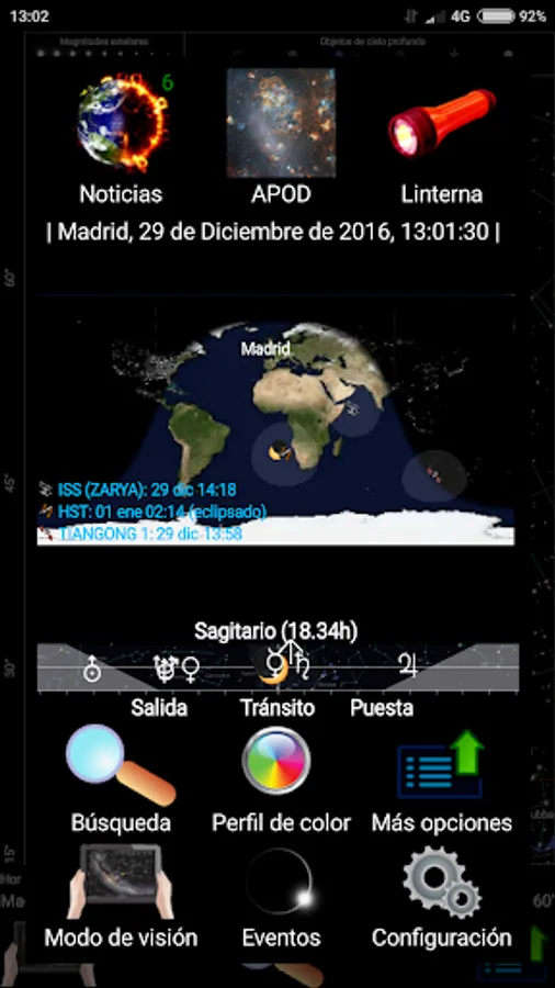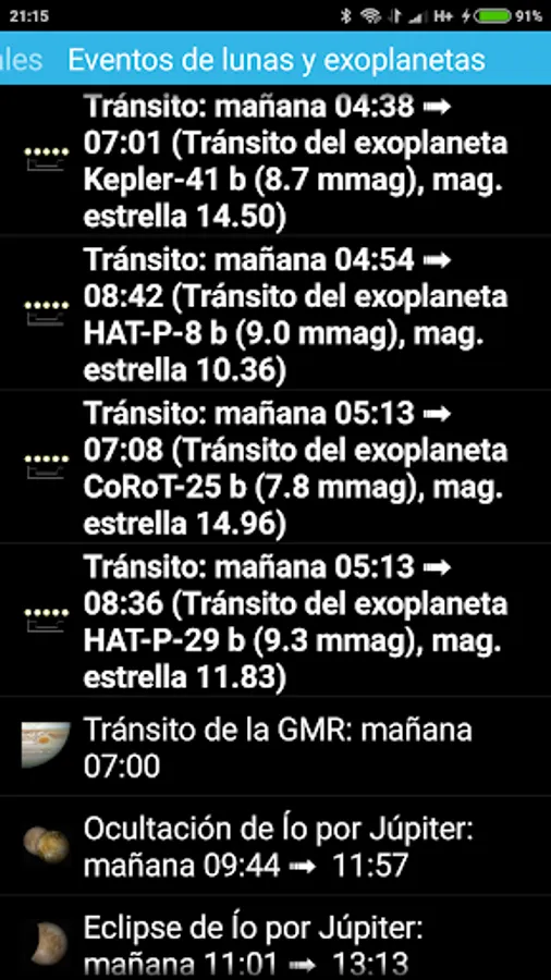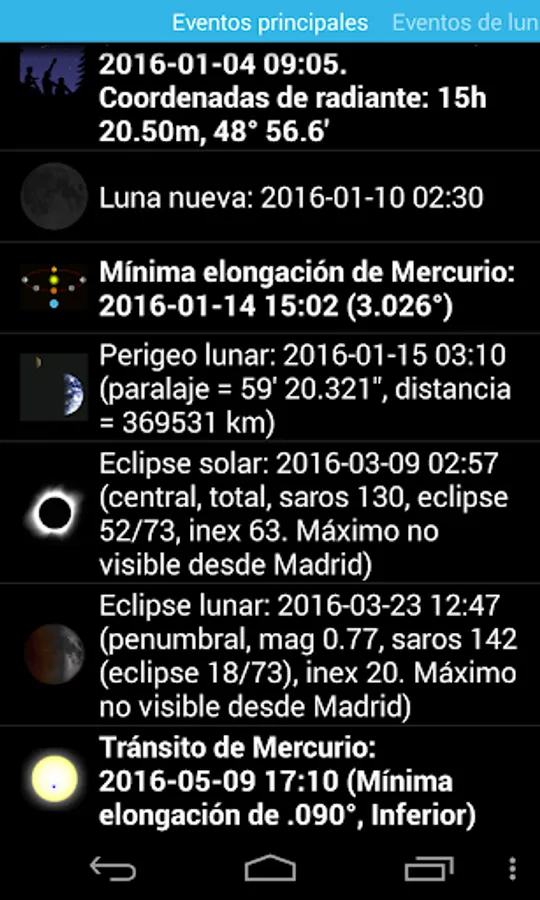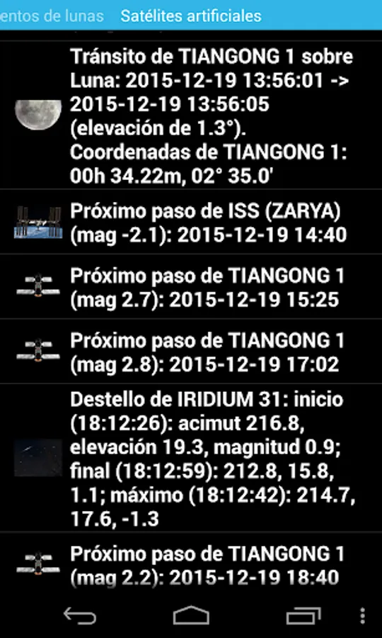 - More complete list of the next main astronomical events (lunar-X, neomenia, among others), events of natural satellites (transits, shadows, eclipses and mutual events in Jupiter, Saturn, and Uranus moons, and next transits of exoplanets), and artificial satellites events (transits above the observer, transits on top of the solar or lunar disks, and on the planets, and Iridium flares).