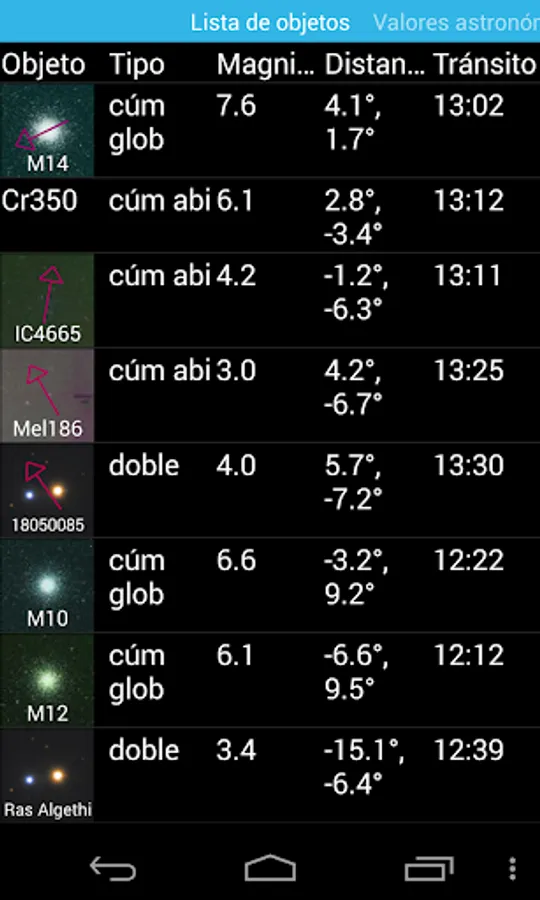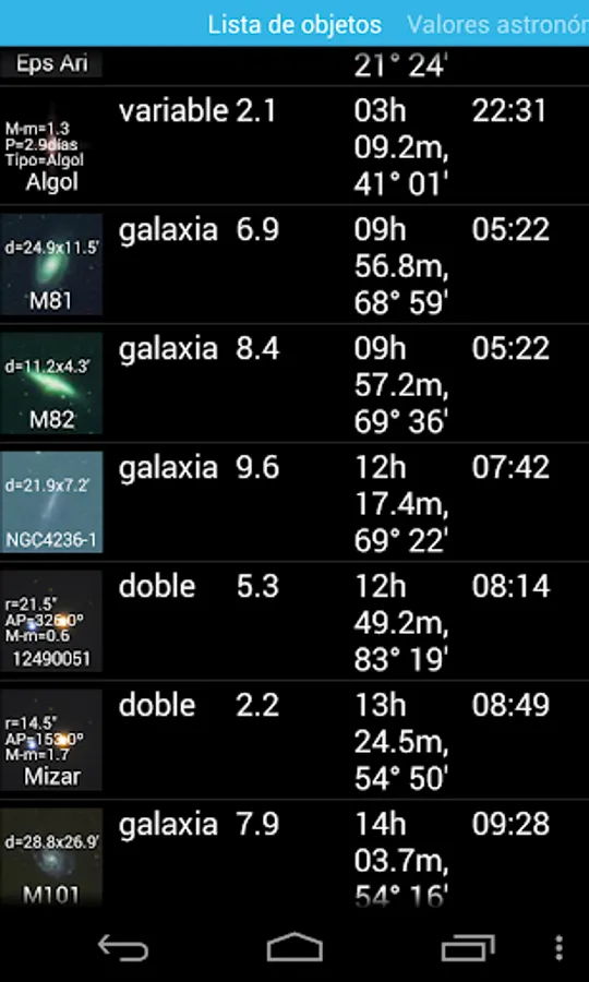 - A text mode listing all objects (more than 100 famous double and another 100 variable stars included) with different sorting options, and with a push-to function when the text mode is selected during the live view. With the device firmly holded on top of a telescope you can locate one object after another in non computerized telescopes. You only need a previous alignment with one object, planet, or star not too far (30 degrees around is fine, depending on the accuracy of the sensors). The device can be holded in an arbitrary orientation, although in that case you will need to search in a list for the object to align to (there's an option for that).