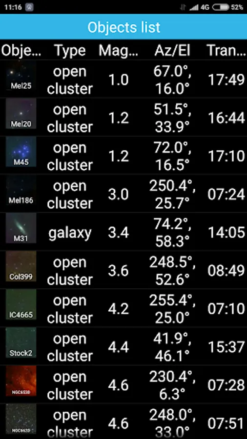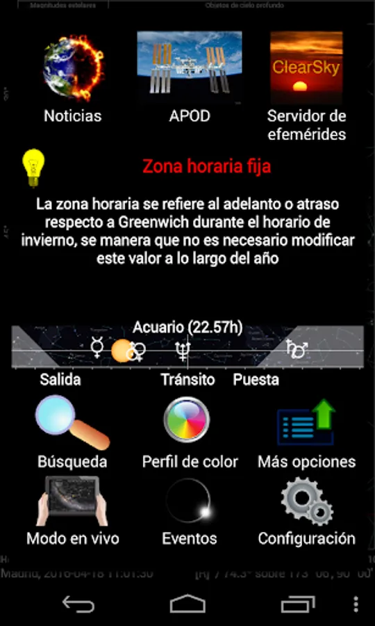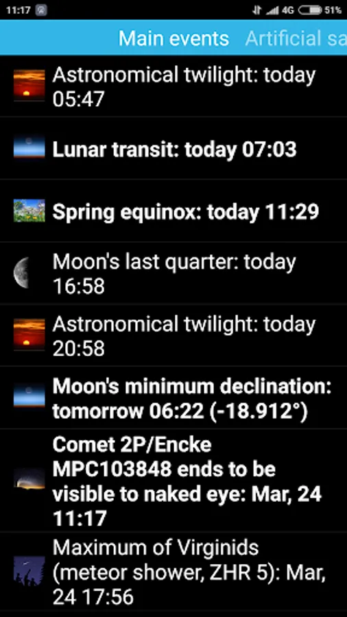 - List of the next main astronomical events (eclipses, lunar phases, meteor showers, transits of ISS and other satellites, and many more), with options like simulating them or setting an alarm.