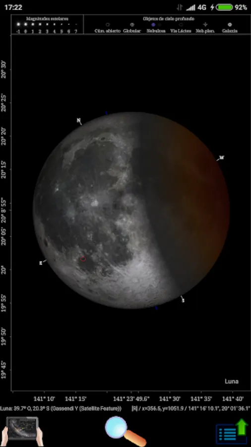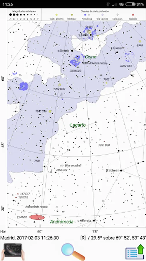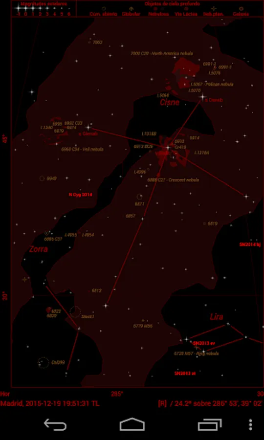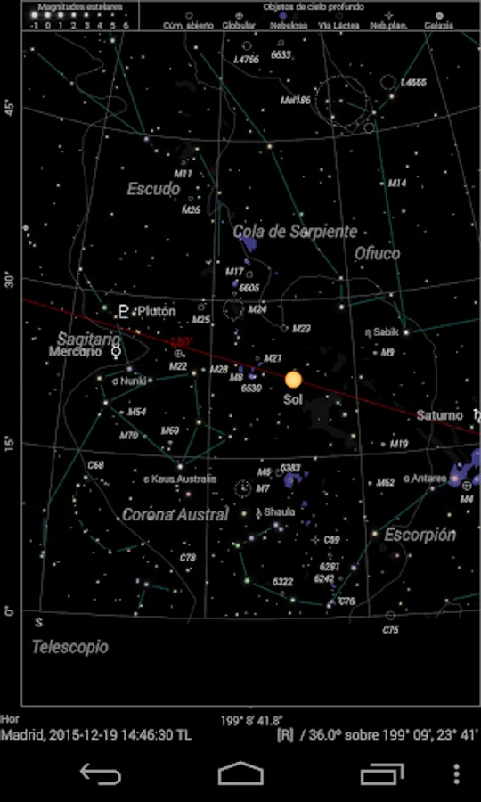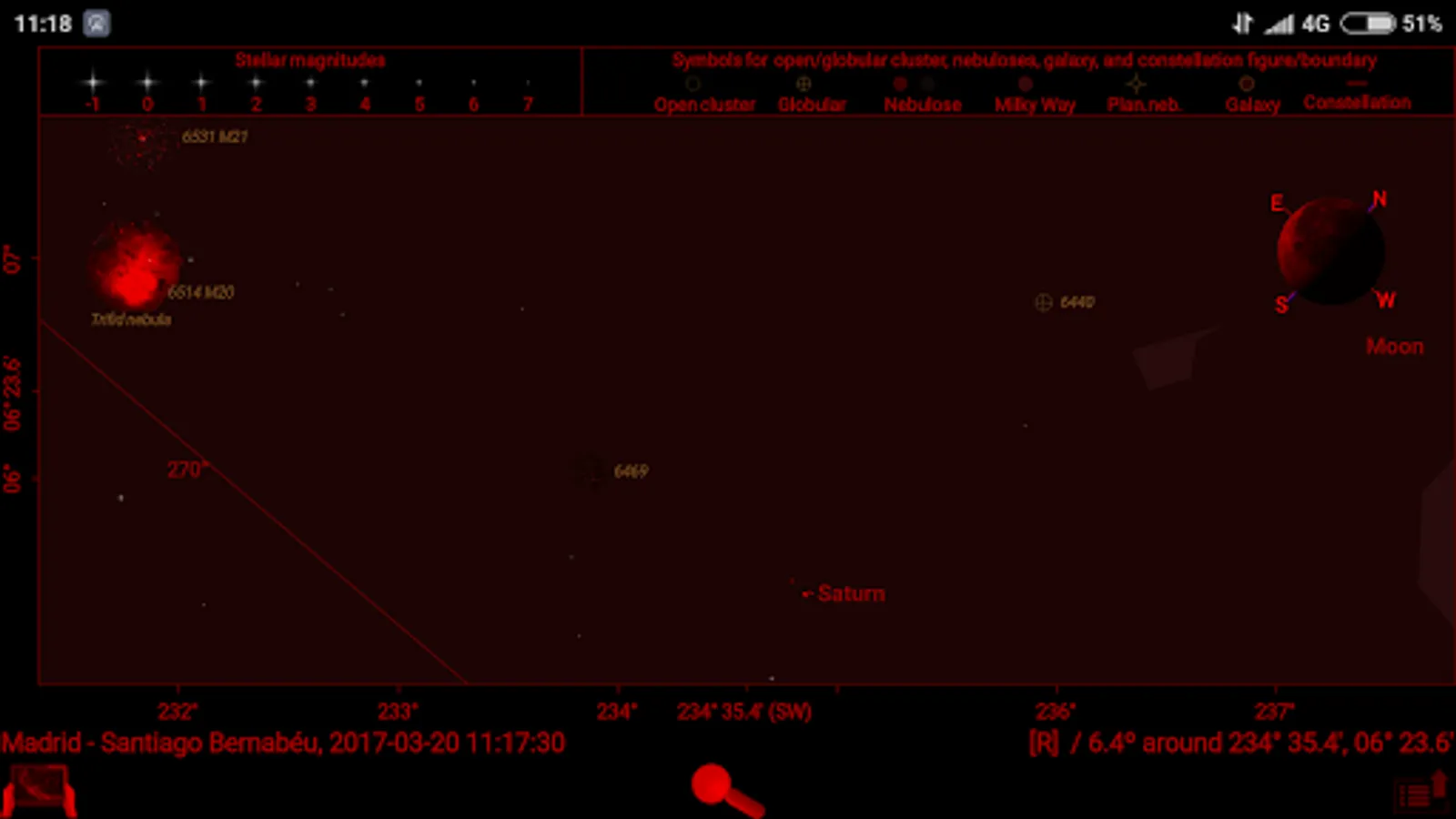 - Clear representation of the sky in realistic or chart-like styles, with several color profiles in the sky and the user interface for different situations. By default the automatic mode will use red colors during the night. Text size in labels is customizable.