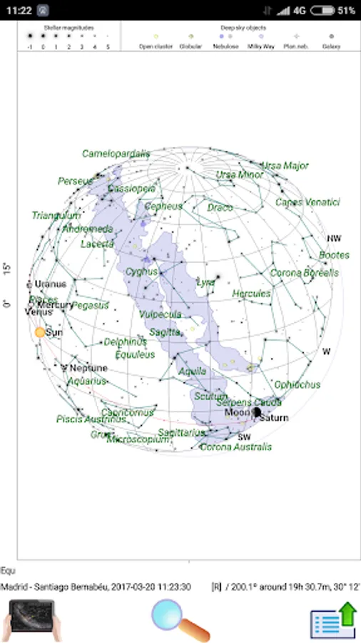 - The sky simulation is static in time and updated in intervals of few minutes (customizable). The objects will not move around all the time and it will be easier to zoom or explore around them.
