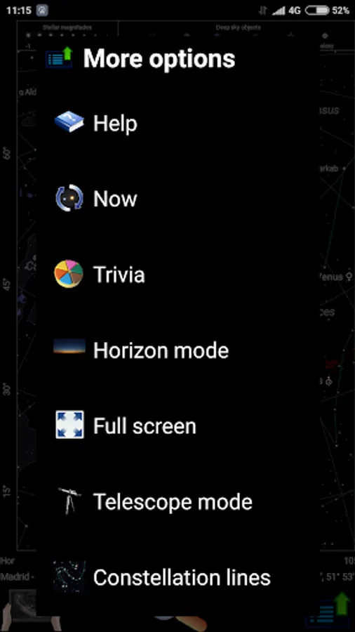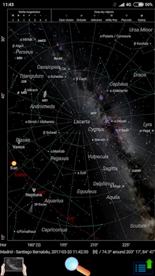 - Easy to use interface, with double click to center, zoom gesture for fast zoom in/out operations, and long click for a context menu to access the details of the body. A little menu at the bottom provides the basic functionalities, with an optional full featured menu that shows the Earth with artificial satellites, a bar with the visibility of the planets, and many useful options. Rotation gesture is by default disabled since the sky is shown in a straight way.