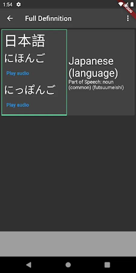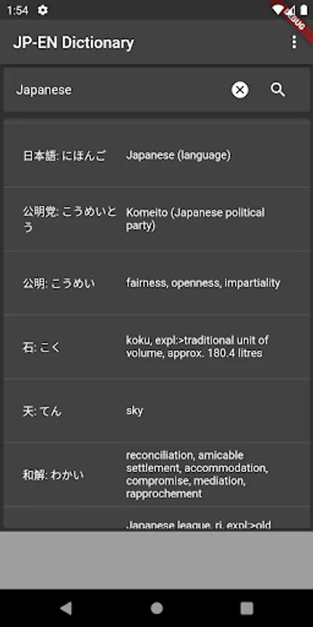 Other features include text-to-speech for hearing pronunciation and the ability to search in either Japanese or English. Search results are ordered in order of frequency of the Japanese word.
