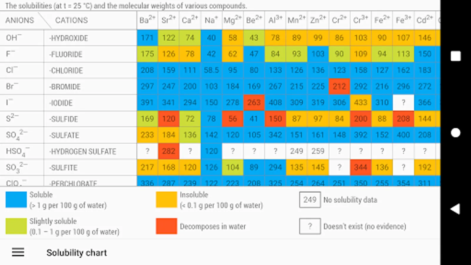 3. The solubility table of salts, acids and bases, which is essential for studying chemistry, especially at school. Solubility is the ability of a substance to form homogeneous systems with other substances - solutions in which the substance stays in the form of individual atoms, ions, molecules or particles. The solubility table is used to verify the reaction conditions. Since the formation of a precipitate (irreversibility of the reaction) is one of the prerequisites of the reaction, the solubility table will help you check whether a precipitate is formed and thereby determine whether the reaction occurs or not.