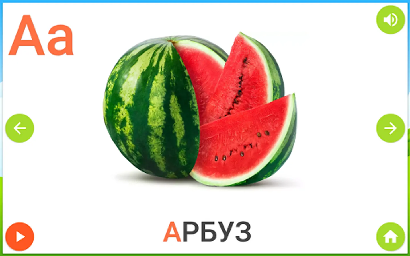 The alphabet is represented in the form of cards with photos of various things, fruits, and animals that are most common to your child from an early age.