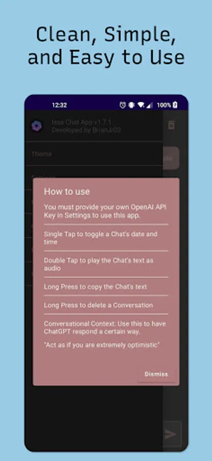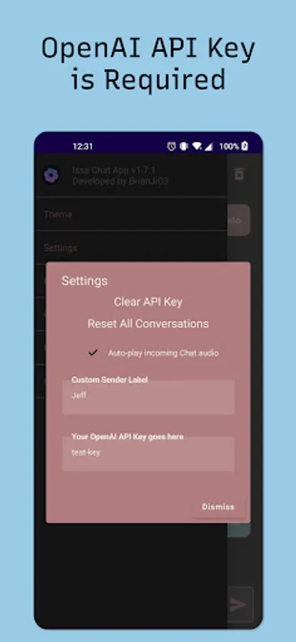 - An OpenAI `API Key` is needed to chat with ChatGPT