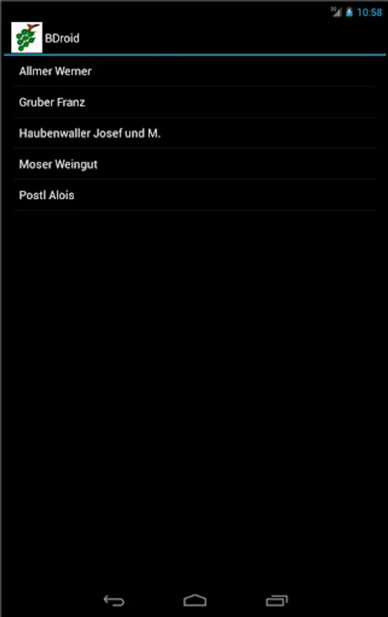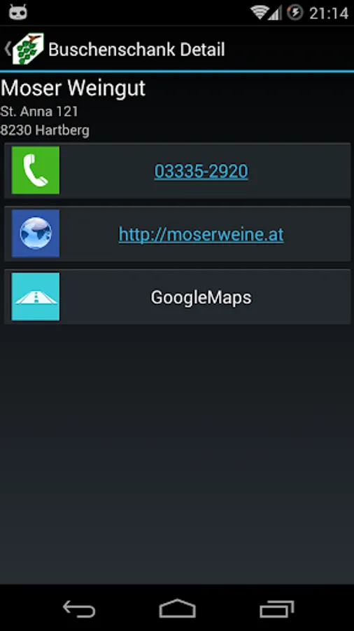 A small App which shows you opened Buschenschänke in the region of the district of Hartberg/Styria/Austria. You get there additional data like opening times, telephone numbers and also the gps-data of the location of these Buschenschank which can be used to instantly navigate there.