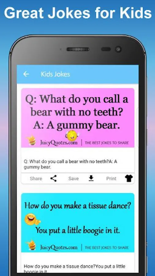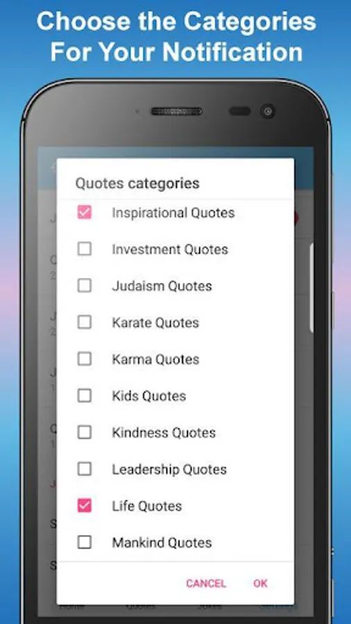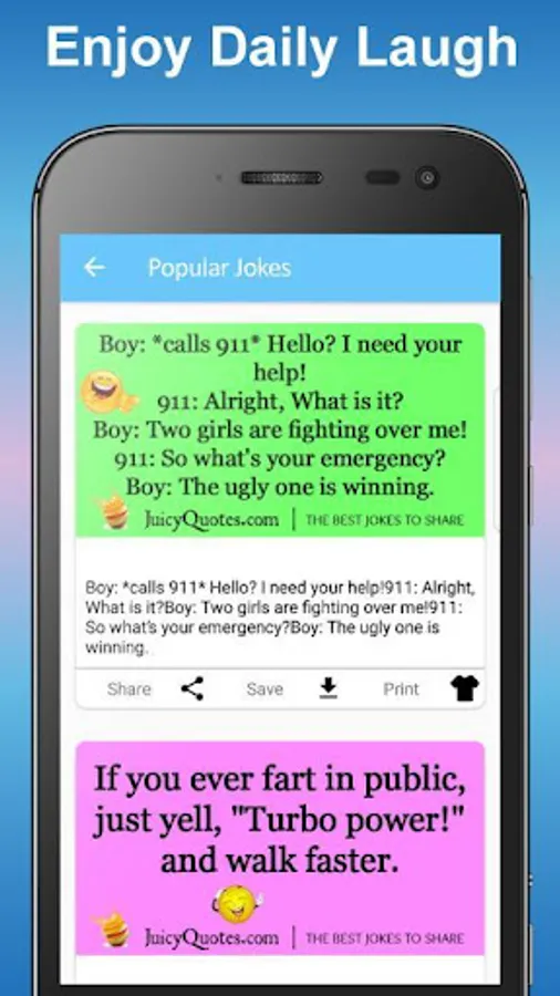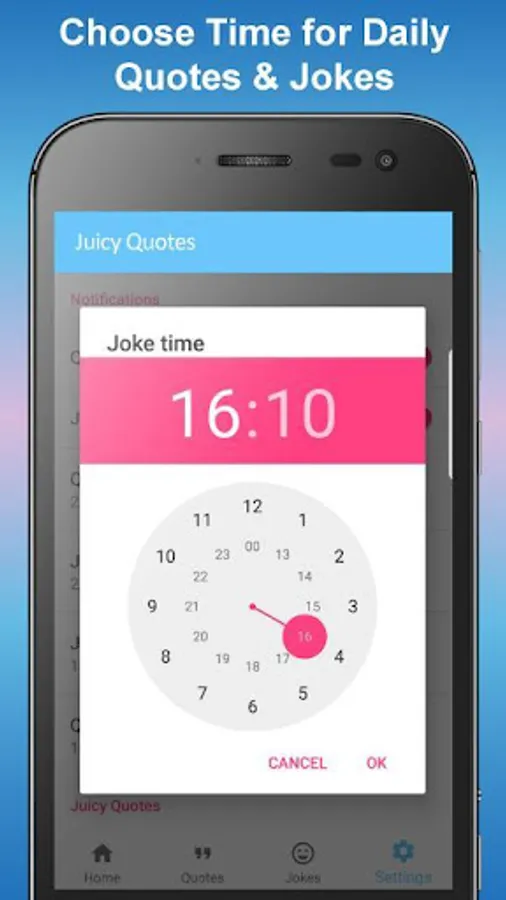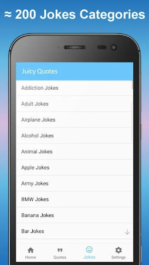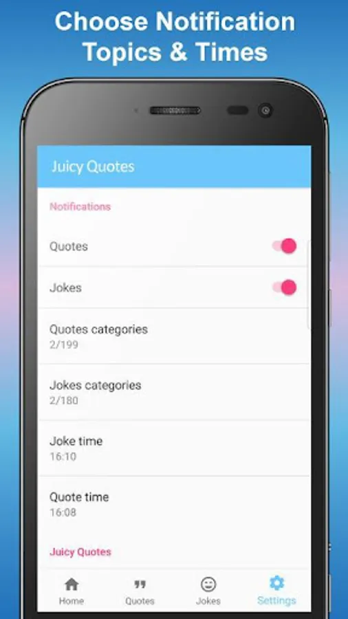 What makes our quotes and jokes app unique is that you can choose exactly what kind of notifications you would like. You can choose to get notified by exactly the categories you have selected for both quotes and sayings as well as jokes and puns. Even better yet you can choose exactly what time of the day you would like to receive a daily quote and daily joke.