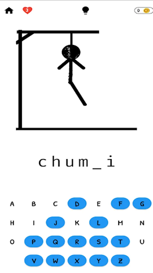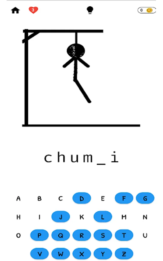 To play you need to guess the letters of the hidden word. If the letter is in the word you get another chance to try, and if its not you get drawn, little by little until the character is hanged.