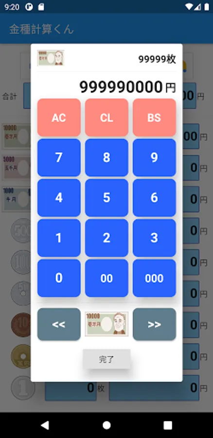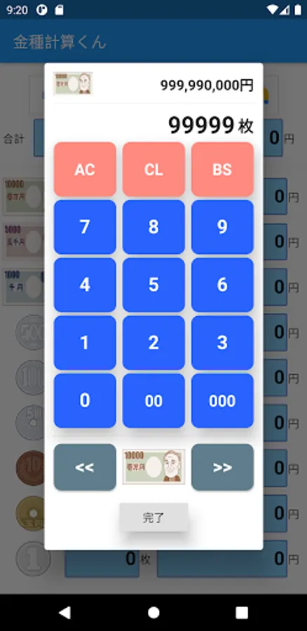 When entering the amount, you can enter up to 99999 sheets x amount (example: 99999 x 10000 yen = 999,990,000 yen for 10,000 yen).