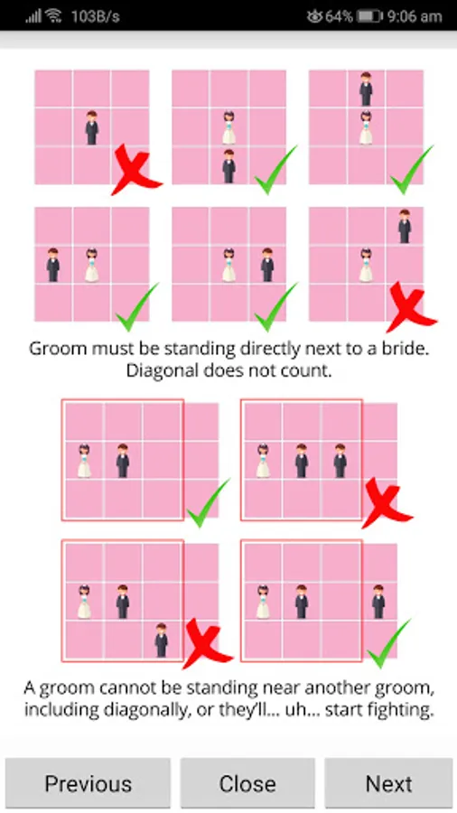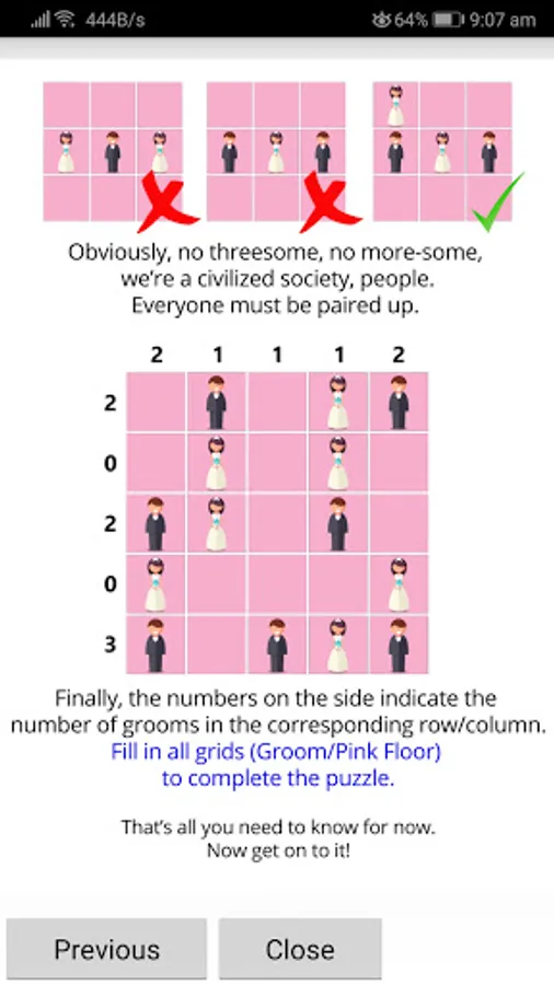 The Wedding Hall Puzzle is a simple, casual puzzle game. To win, match the brides and grooms in correct order, based on a few simple set of rules. Work your way up from small, easy puzzles to bigger, more challenging puzzles.