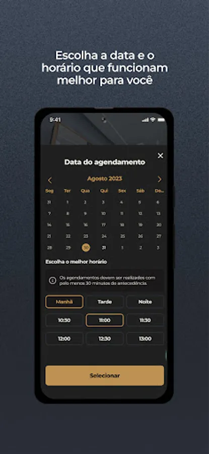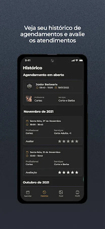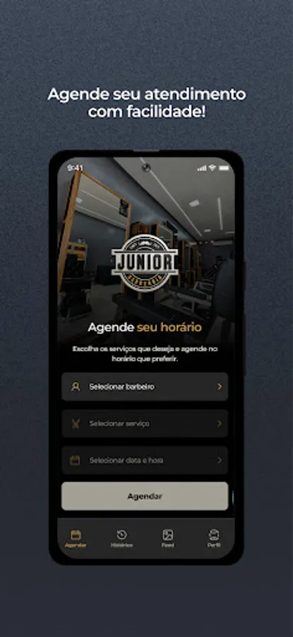 Through the Júnior Barbearia app, clients can schedule appointments in a much more convenient way. On the home screen, it's possible to select the services and time desired for your next appointment. On the history screen, you can confirm or cancel your appointments. Clients can also edit their information, such as email, profile picture, and phone number, on their profile screen.