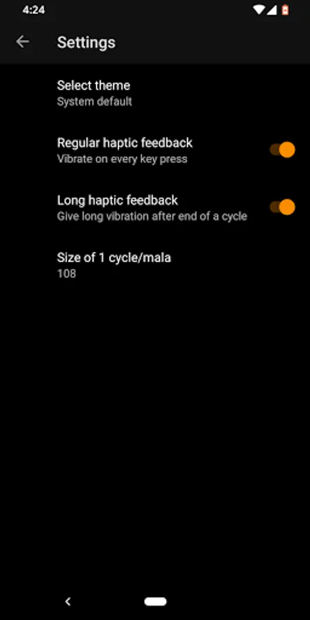 10. Mala counter : It shows how many malas (cycle of 108 counts) you have counted.