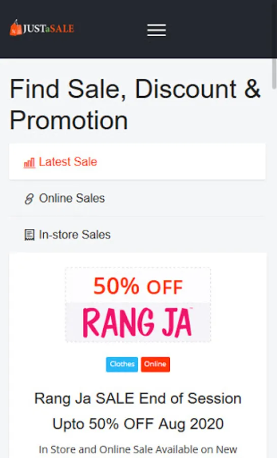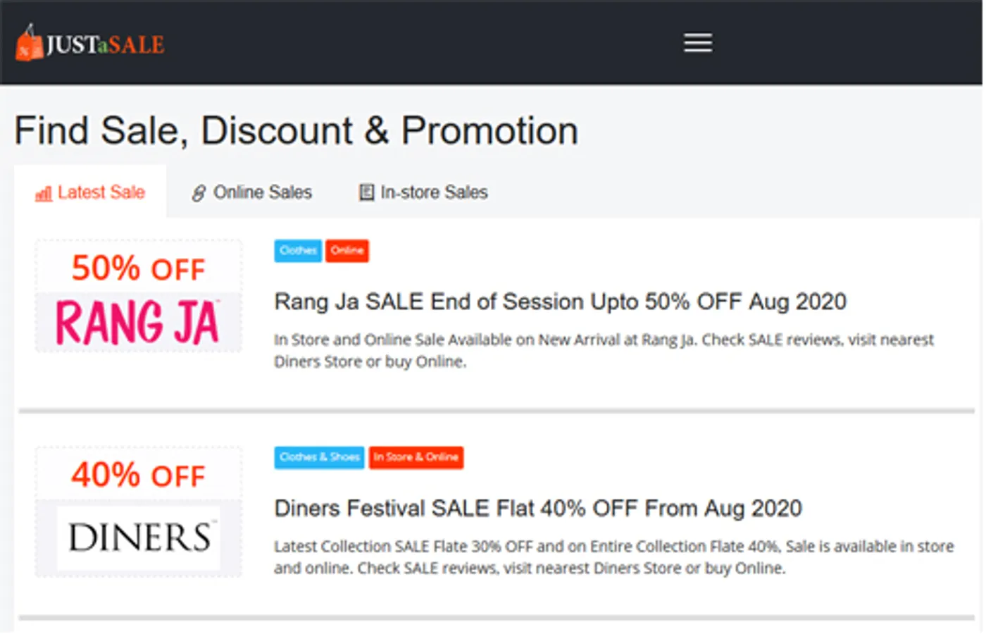 Easy to find what is on sale or discount today. Sales of top brands at one place. Sale or discount on clothes and shoes. Check reviews of sales and visit store