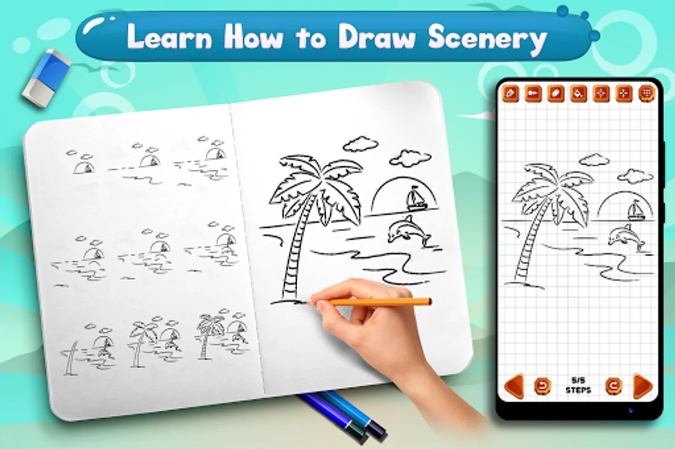 You don't need any special skills, just start drawing, be creative and impress your friends and family with your amazing skills by using this Free Learn to Draw Scenery & Landscapes Book App.