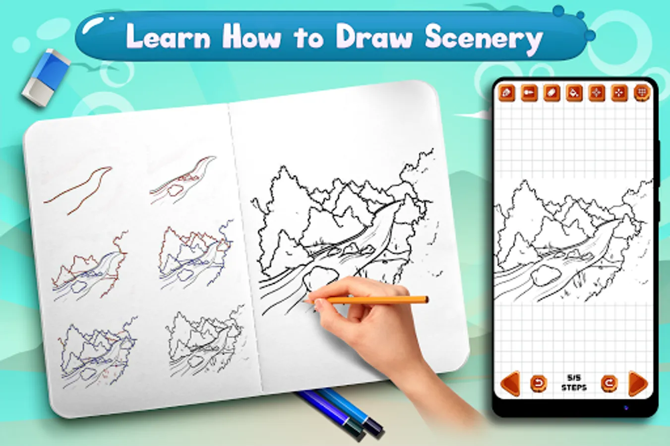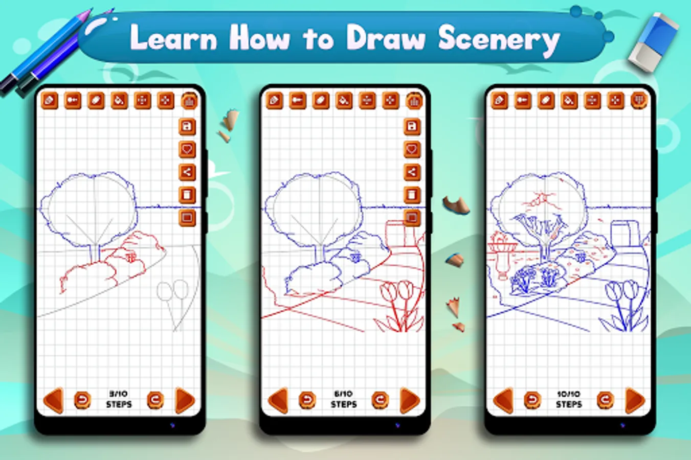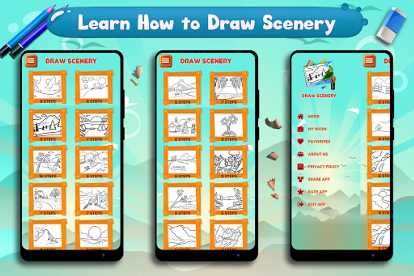 Learn to Draw Scenery & Landscapes is perfect app for those who love drawing nature, mountains, village, rice fields, sun and waterfalls. This app teaches you how to draw sceneries, landscapes and natural scenes in simple steps and improve your confidence of drawing and coloring.