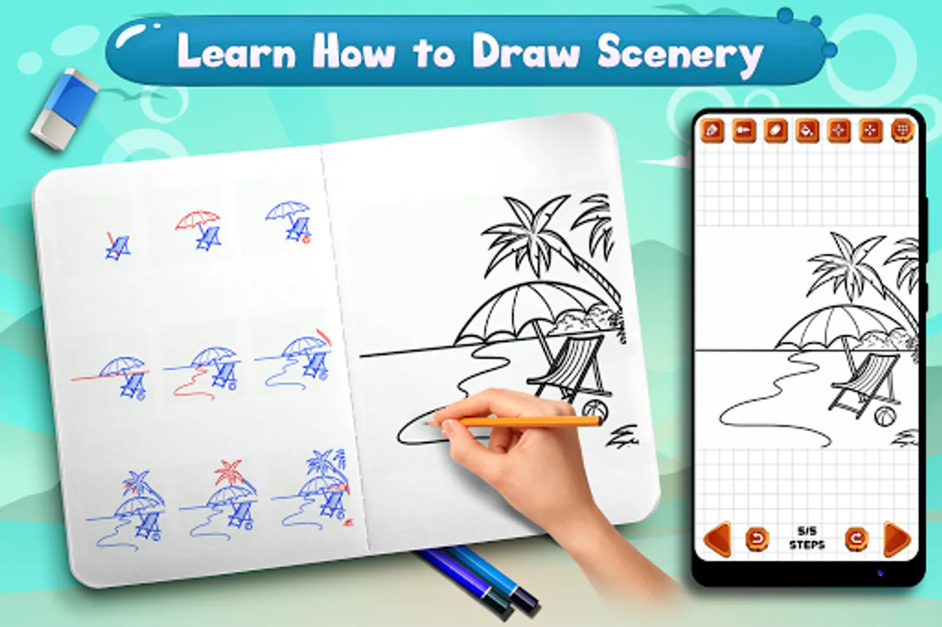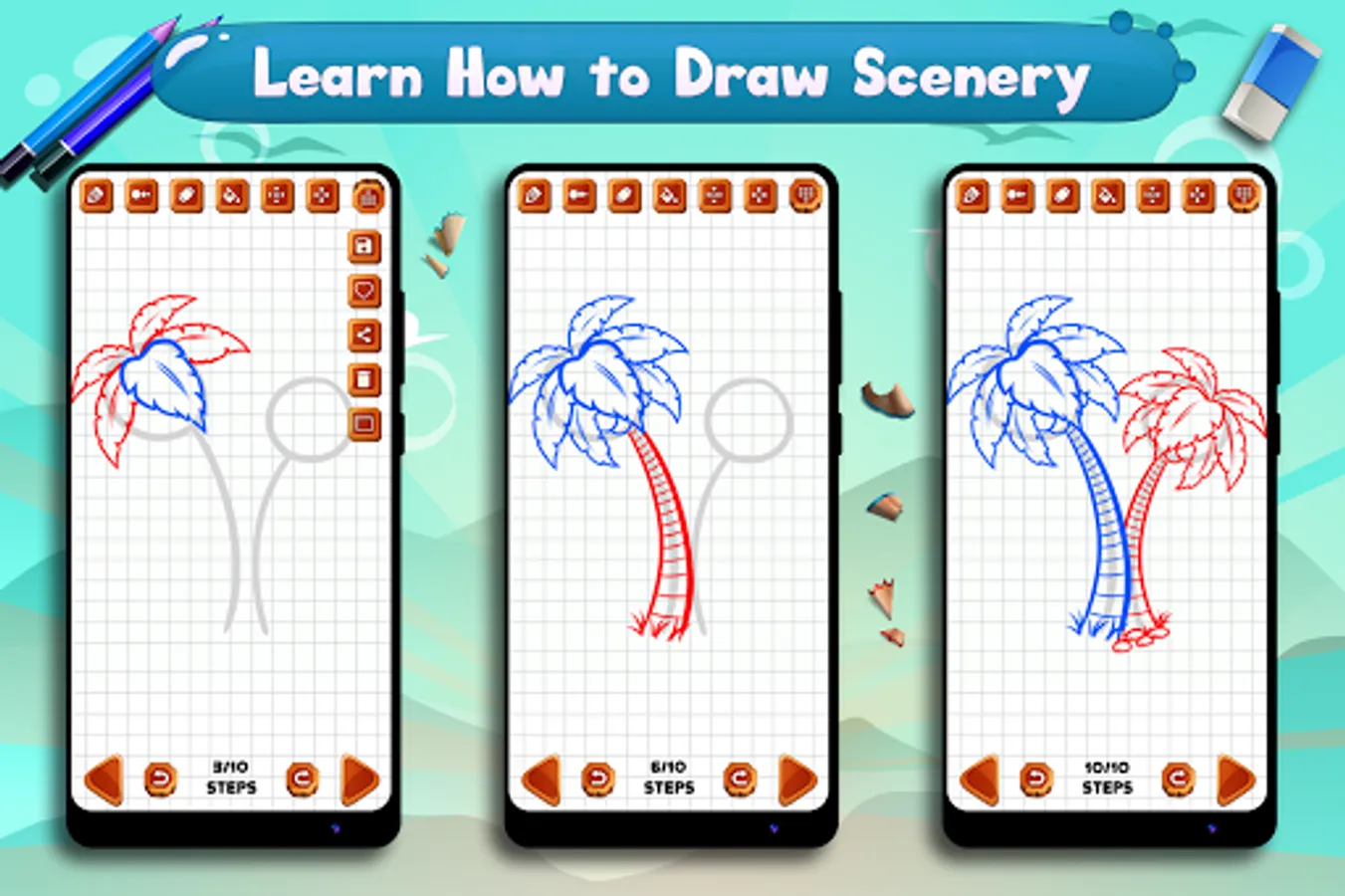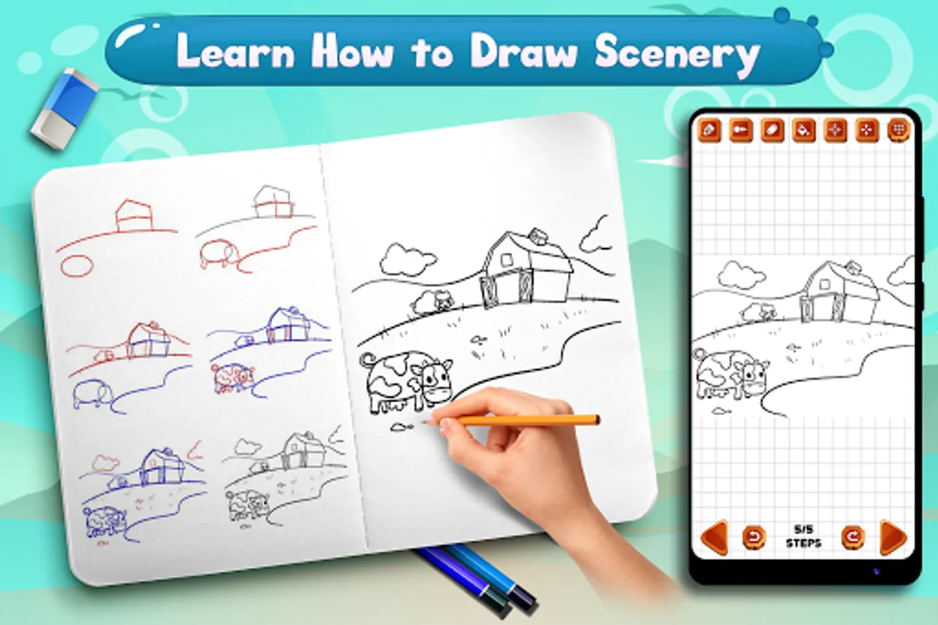 Learn to Draw Scenery & Landscapes is perfect app for those who love drawing nature, mountains, village, rice fields, sun and waterfalls. This app teaches you how to draw sceneries, landscapes and natural scenes in simple steps and improve your confidence of drawing and coloring.