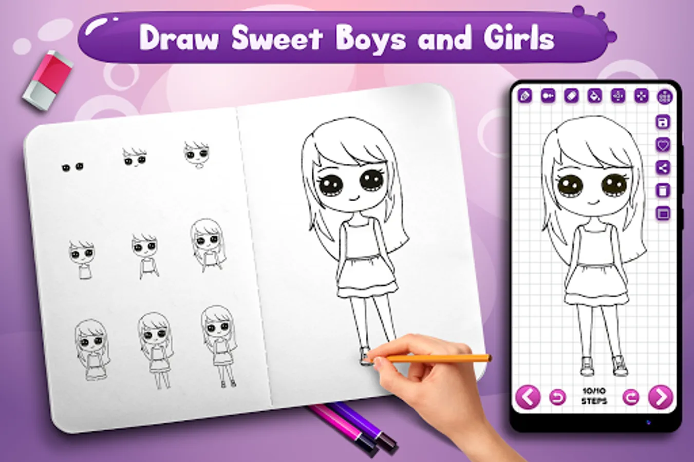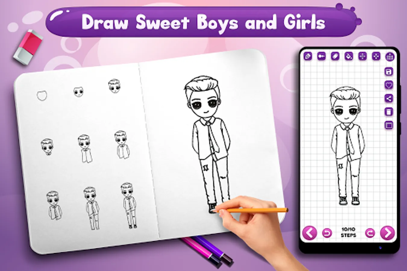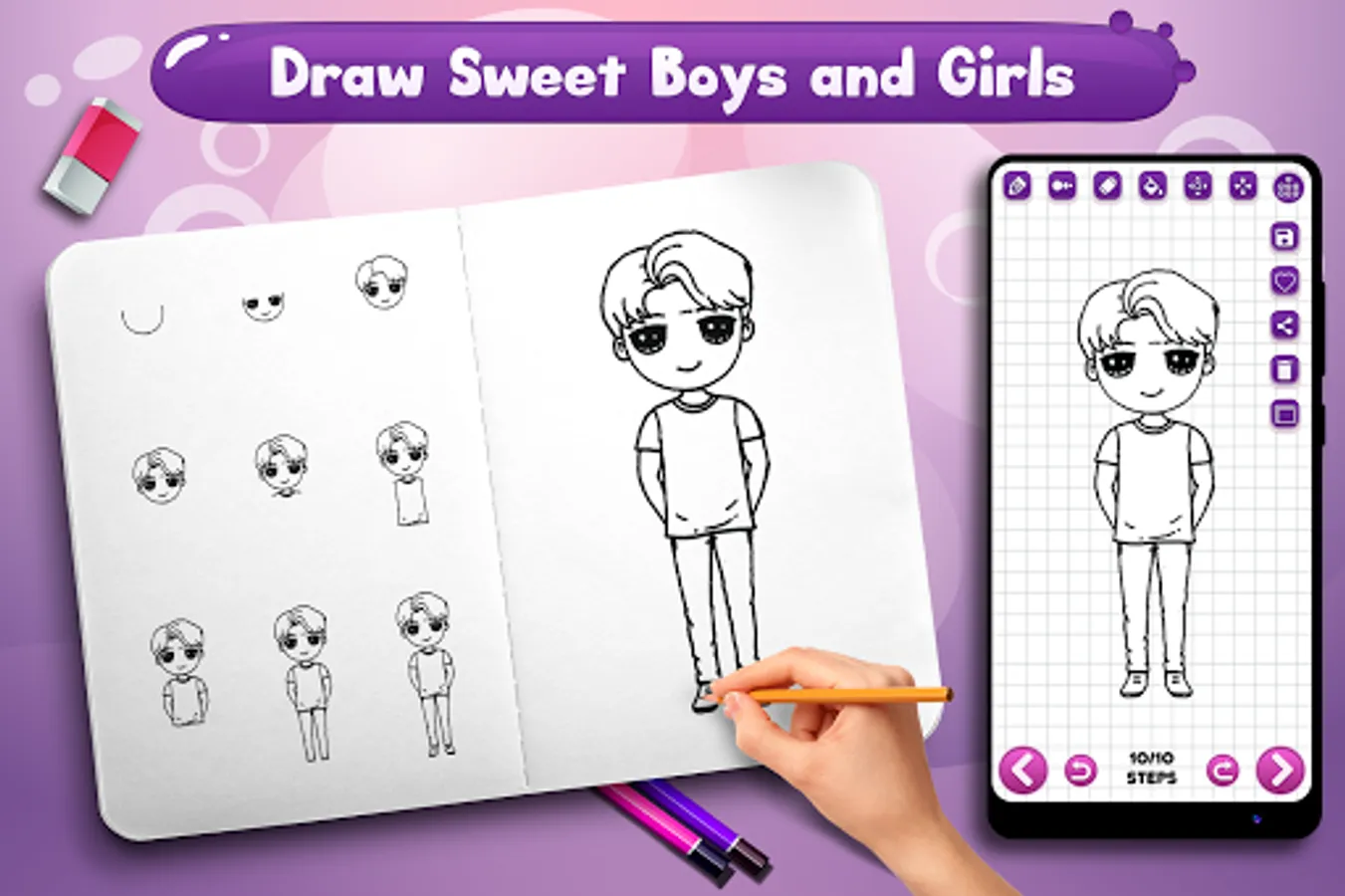 Learn to Draw Sweet Boys and Girls is perfect app for those who love drawing beauty and cuteness. This App teaches you how to draw cute chibi famous girls and boys in simple steps and improve your confidence of drawing and coloring.