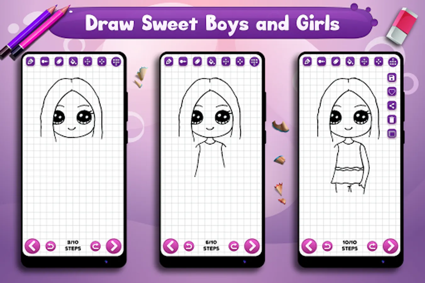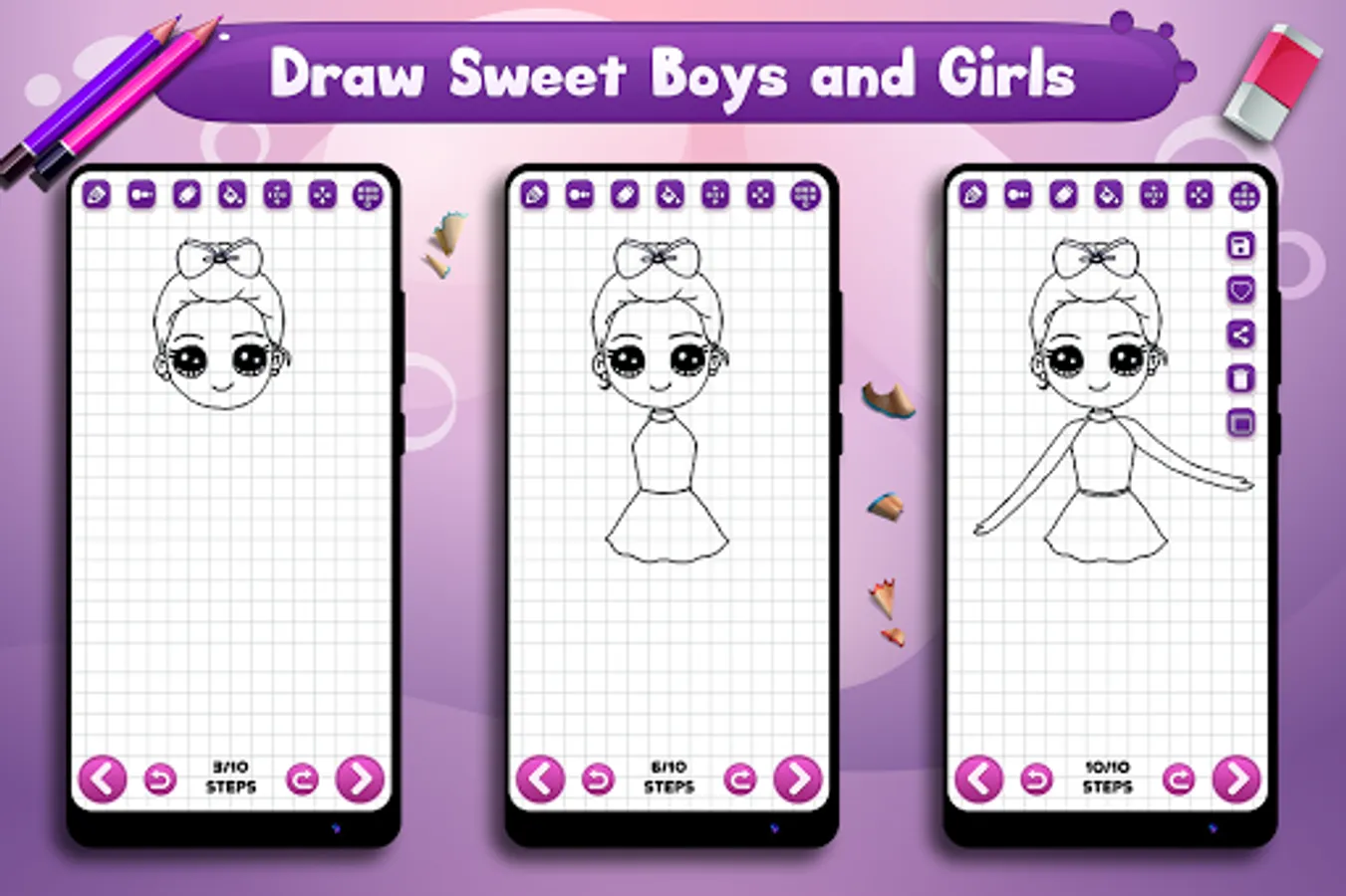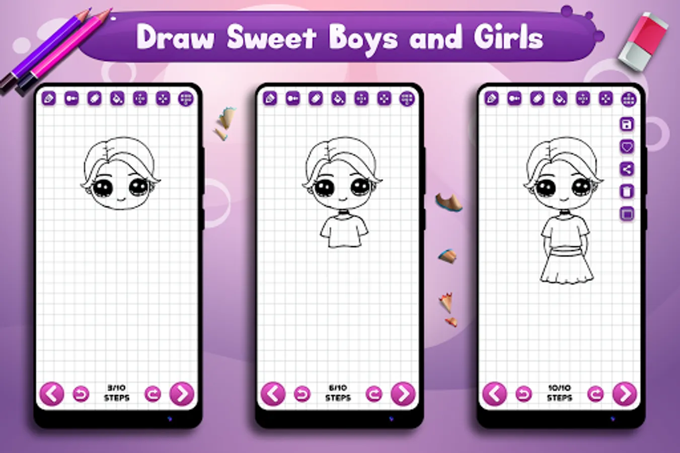 Learn to Draw Sweet Boys and Girls is perfect app for those who love drawing beauty and cuteness. This App teaches you how to draw cute chibi famous girls and boys in simple steps and improve your confidence of drawing and coloring.