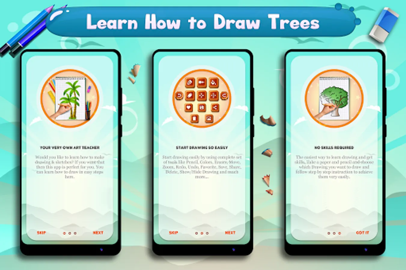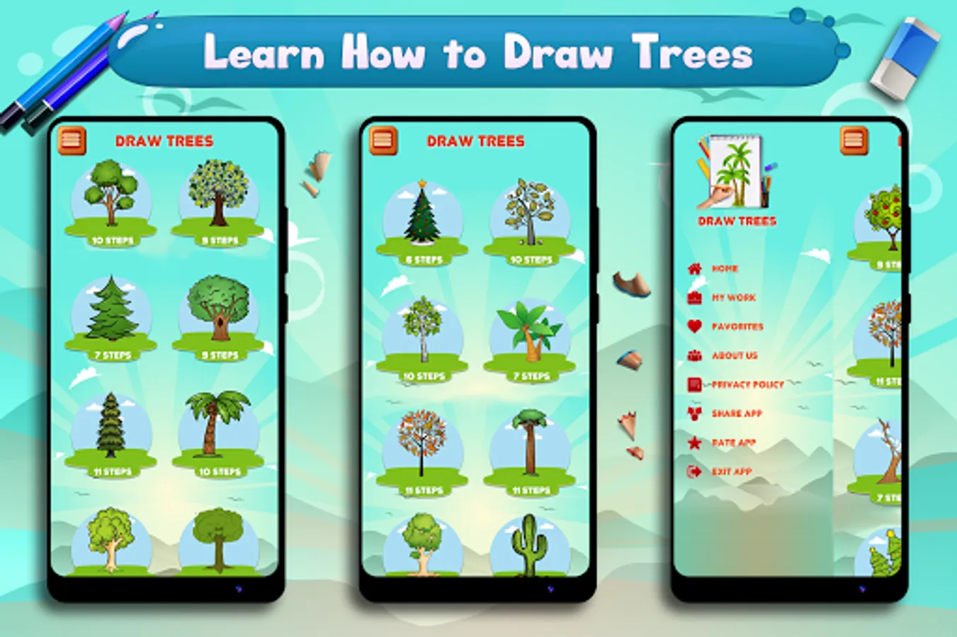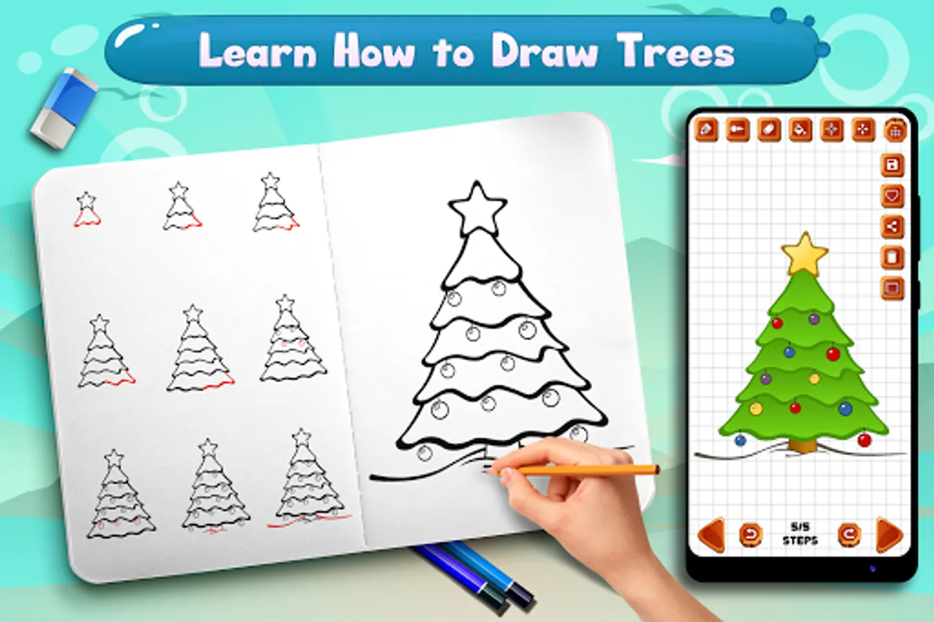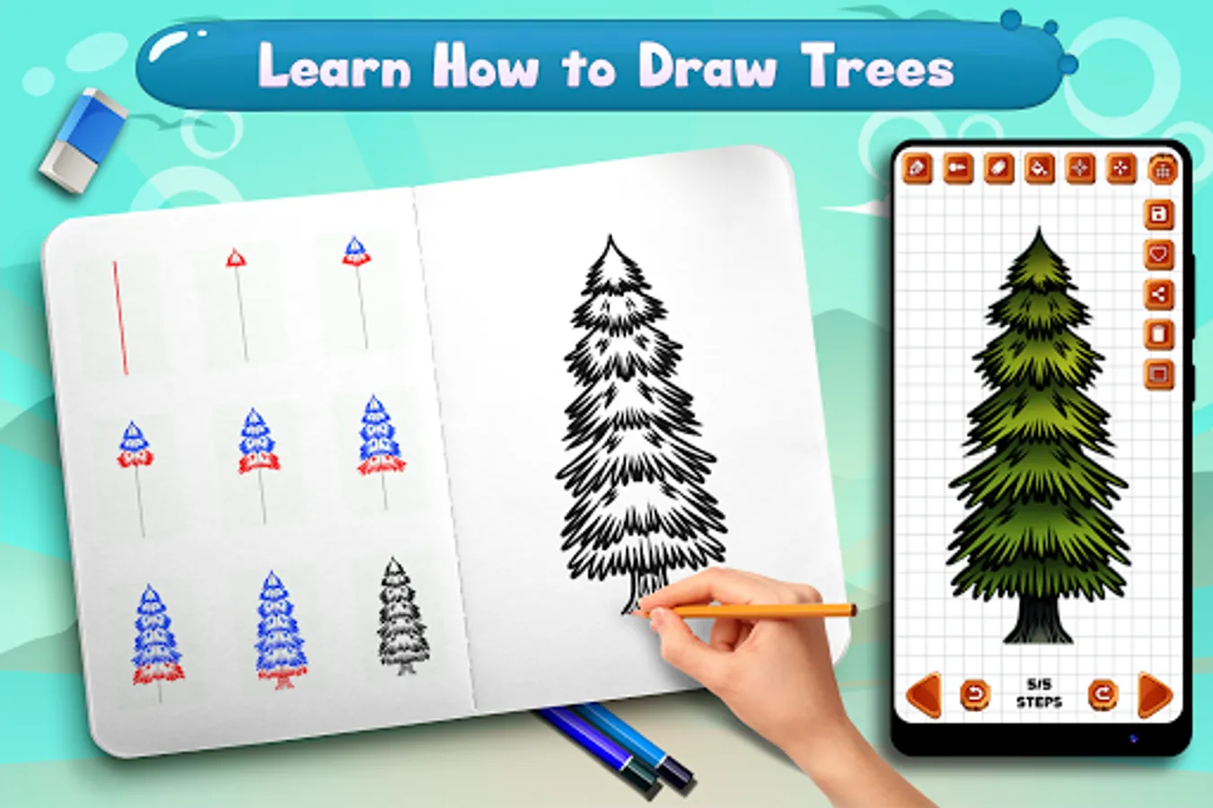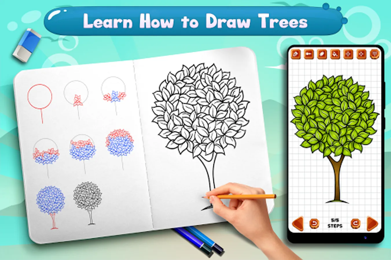 You don't need any special skills, just start drawing, be creative and impress your friends and family with your amazing skills by using this Free How to Draw Trees Book App.