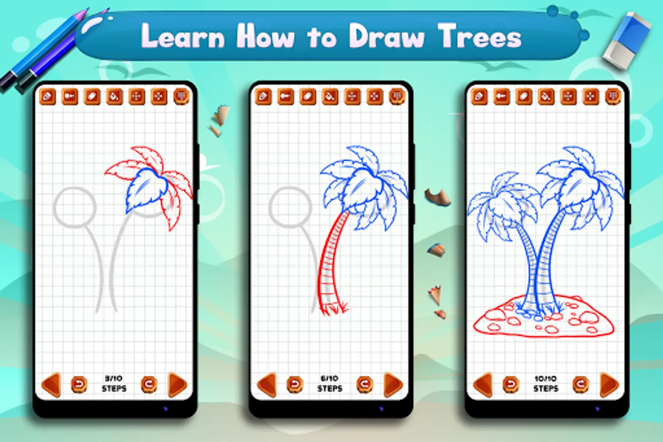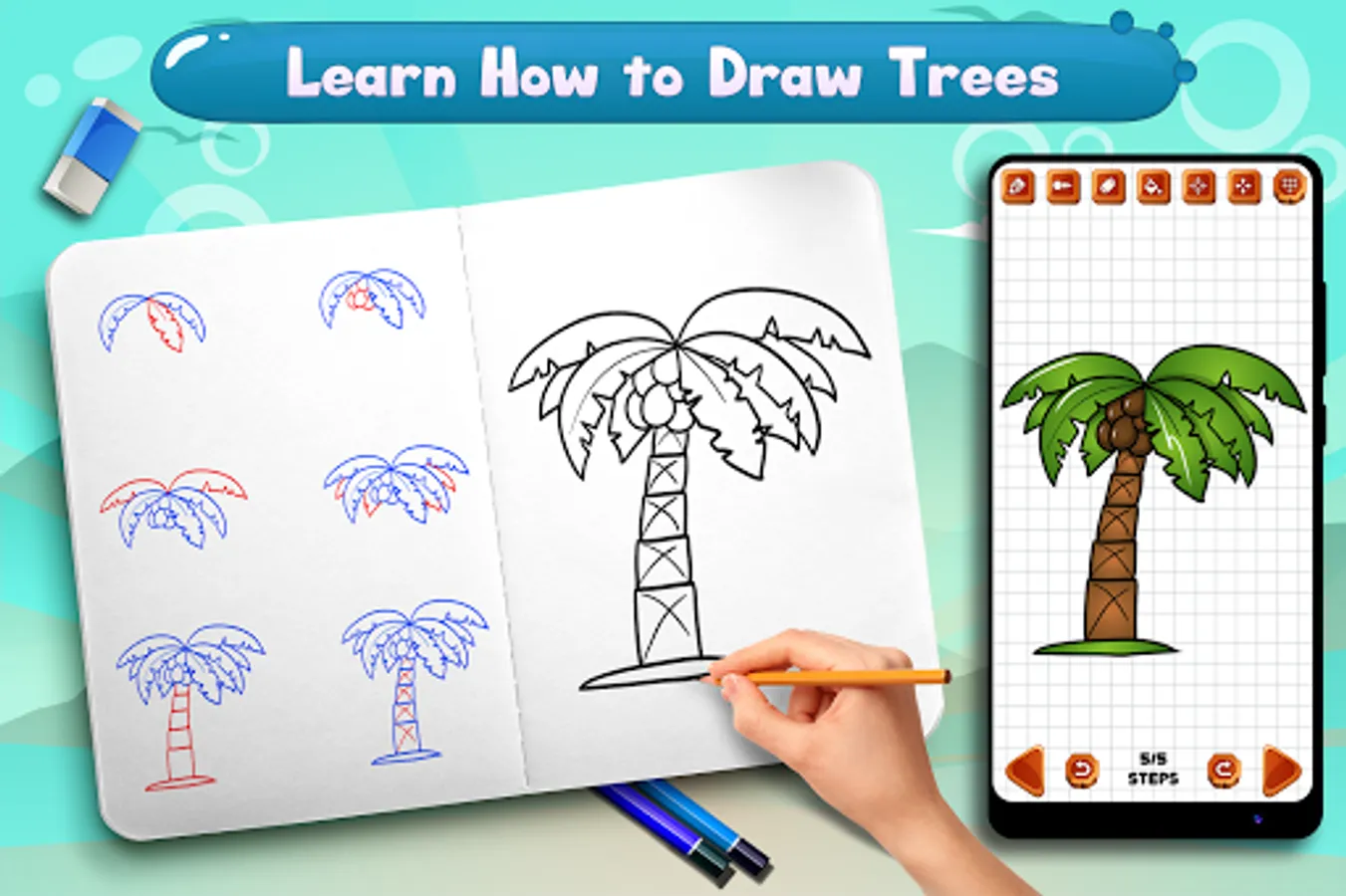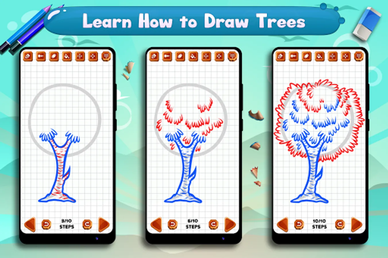 Learn to Draw Trees is perfect app for those who love drawing nature and the beauty. This app teaches you how to draw different type of trees from your favorite sceneries, landscapes and natural scenes in simple steps and improve your confidence of drawing and coloring.
