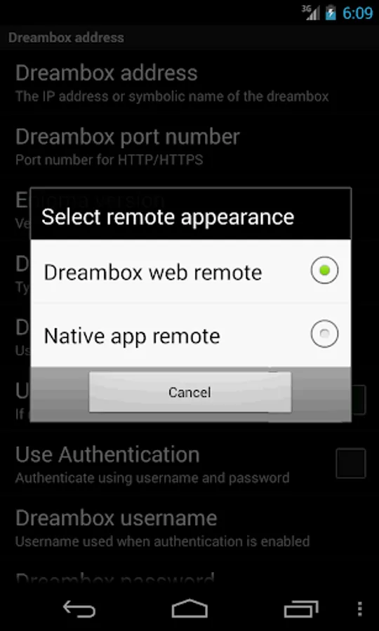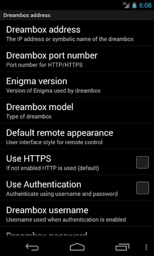 The first time this app is used it will attempt to automatically detect the address of the dreambox. If the autodetection fails the dreambox address has to be configured manually. To configure the dreambox address select Settings from the options menu (see screenshots above).